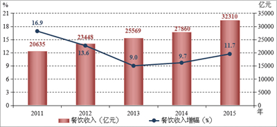1月19日,國(guó)家統(tǒng)計(jì)局發(fā)布數(shù)據(jù),2015年全國(guó)餐飲收入實(shí)現(xiàn)32310億元,同比增長(zhǎng)11.7%,增速比上年提升2.0個(gè)百分點(diǎn);限上餐飲收入8667億元,同比增長(zhǎng)7.0%,高于上年4.8個(gè)百分點(diǎn)。