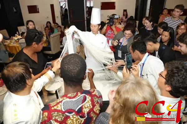 活動(dòng)當(dāng)天恰逢訪問(wèn)團(tuán)法國(guó)和尼日利亞的兩位學(xué)員的生日,玉林烤鴨店精心為兩位“壽星”準(zhǔn)備了西式生日蛋糕和中式長(zhǎng)壽面。隨著蛋糕手推車(chē)緩緩?fù)葡驎?huì)場(chǎng),嘉賓們不由自主地唱起了生日快樂(lè)歌為兩位外國(guó)朋友送去祝福。兩碗長(zhǎng)壽面每碗都是面點(diǎn)師用一根面制成的,當(dāng)兩位“壽星”得知一根面代表長(zhǎng)生不老的祝福時(shí),更為其蘊(yùn)含的中國(guó)文化所動(dòng)容。