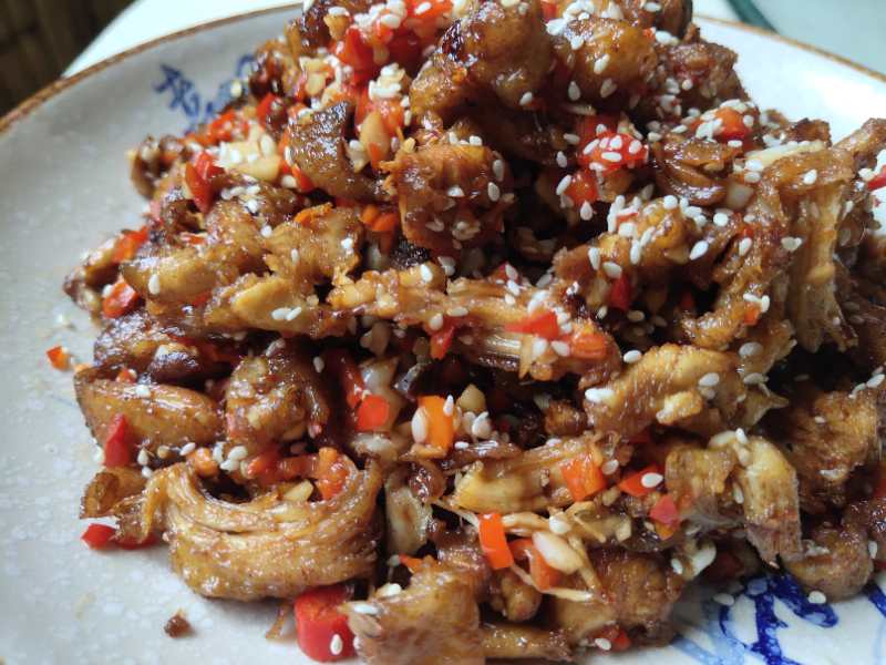 手撕雞炒制的非常入味,肉質(zhì)細(xì)膩且富有彈性,肥瘦剛剛好,一口咬下去油花滋飛,剛碰到牙齒,滿嘴都是雞肉的香味,微微嗆喉的辣椒給味蕾帶來(lái)了另一番滋味,一切都恰到好處。熱辣的醬汁淌過(guò)舌頭直達(dá)喉嚨,勁道十足的雞肉在舌尖也留有余香,就連骨頭嚼起來(lái)也很有滋味。