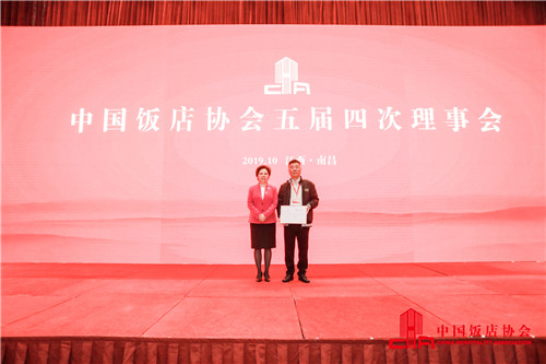 韓明會(huì)長(zhǎng)為中國(guó)飯店協(xié)會(huì)資深副會(huì)長(zhǎng)戴寧頒發(fā)證書