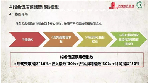 報告建立了“綠色飯店領跑者指數模型”,將為綠色飯店實現運營層面短期目標及資產層面長遠目標起到指導性作用。綠色飯店領跑者模型在設計方面,采用多層次指標體系,充分考慮了酒店在建筑效率、收入創(chuàng)造、利潤實現、資源消耗等四大方面的發(fā)展情況。通過四大核心指標、18個單項指標,該模型全面系統地反映出綠色飯店在建筑設計環(huán)節(jié)的效率性、在運營效率方面是否存在提升空間、以及在資源消耗方面是否存在問題,從而形成具前瞻性的運營監(jiān)督,實現最大化現金流增長,實現短期盈利目標,進而通過高效的業(yè)績優(yōu)化方案,為酒店創(chuàng)造新的增長動力,實現長期可持續(xù)發(fā)展目標。