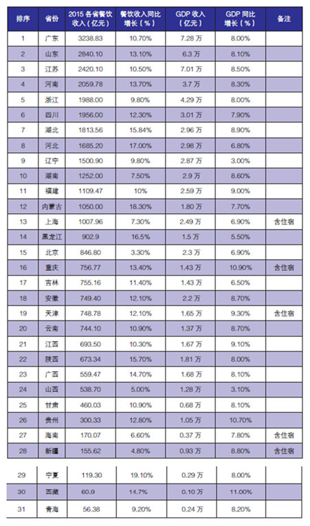 2016 年度國內(nèi)各省市餐飲收入排行(2015 財年)