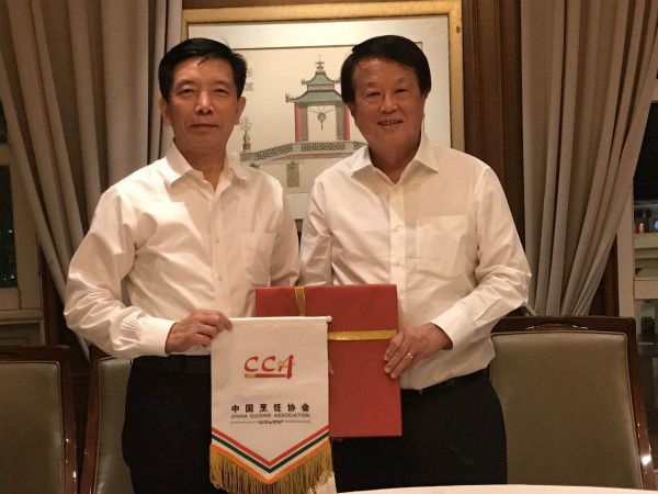中國烹飪協(xié)會會長姜俊賢向益海嘉里集團豐益國際有限公司董事長郭孔豐贈送紀念品
